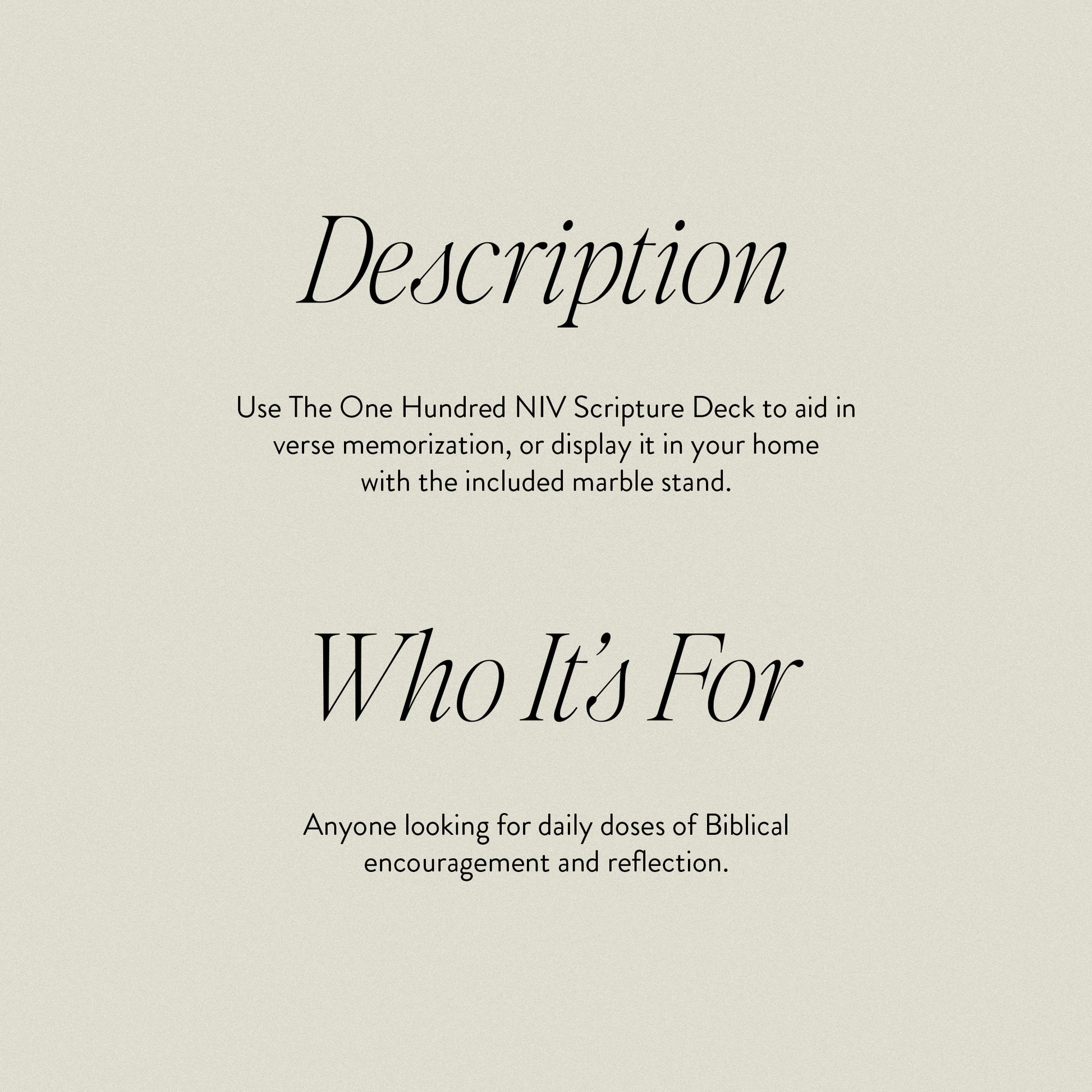 Use The One Hundred NIV Scripture Deck to aid in verse memorization, or display it in your home with the included marble stand.